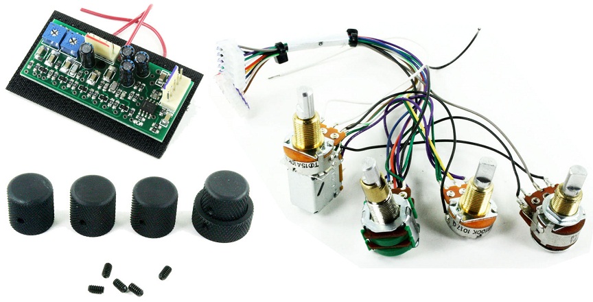 - W zestawie: potencjometry, klips na baterię, gniazdo stereo i czarne nakładki na potencjometry (typu Dome Knobs)