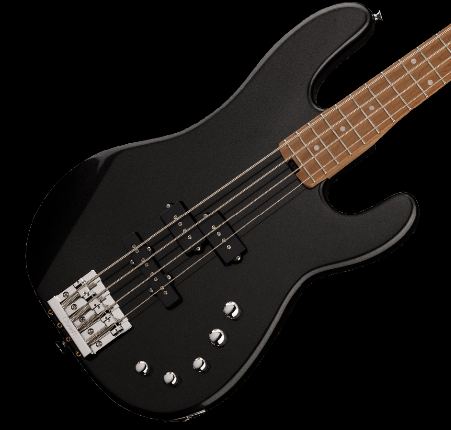 Gitara basowa Charvel Pro-Mod San Dimas Bass PJ IV MET BLK nawiązuje do tradycji producenta i jego instrumentów z lat 70. Posiada ten sam kształt, co oryginalne basy San Dimas, które posiadają głębsze wycięcie pozwalające na lepszy dostęp do wyższych progów. Do stworzenia tego instrumentu zostało wykorzystane najwyższej jakości drewno - olcha do korpusu oraz karmelizowany klon do gryfu wzmacnianego grafitowymi prętami i podstrunnicy z rolowanymi krawędziami. Posiada ona także radius złożony dla najwyższej wygody.  Dużą zaletą tego basu są także świetnie przetworniki wykonane przez DiMarzio. Konfiguracja PJ uwzględnia Model J DP123 dla potężnego, wyrazistego uderzenia i Model P DP122 dający ciepłe i tłuste brzmienie. Dostajemy także dostęp do wszechstronnej kontroli uwzględniającej kontrolę mieszania pickupów, regulator głośności z selektorem push/pull do wyboru elektroniki pasywnej/aktywnej oraz 3-pasmowy korektor. Umożliwia to dalsze korzystanie z instrumentu w nagłej sytuacji rozładowanej baterii. Zestaw tunerów oraz mostek Charvela świetnie trzyma strój oraz wzmacnia sustain. Czarne wykończenie Metallic Black prezentuje się niesamowicie, a znaczniki boczne Luminlay świecą w ciemności i pozwalają na precyzyjne poruszanie się po gryfie w każdych warunkach.  Charvel Pro-Mod San Dimas Bass PJ IV MET BLK - specyfikacja:
