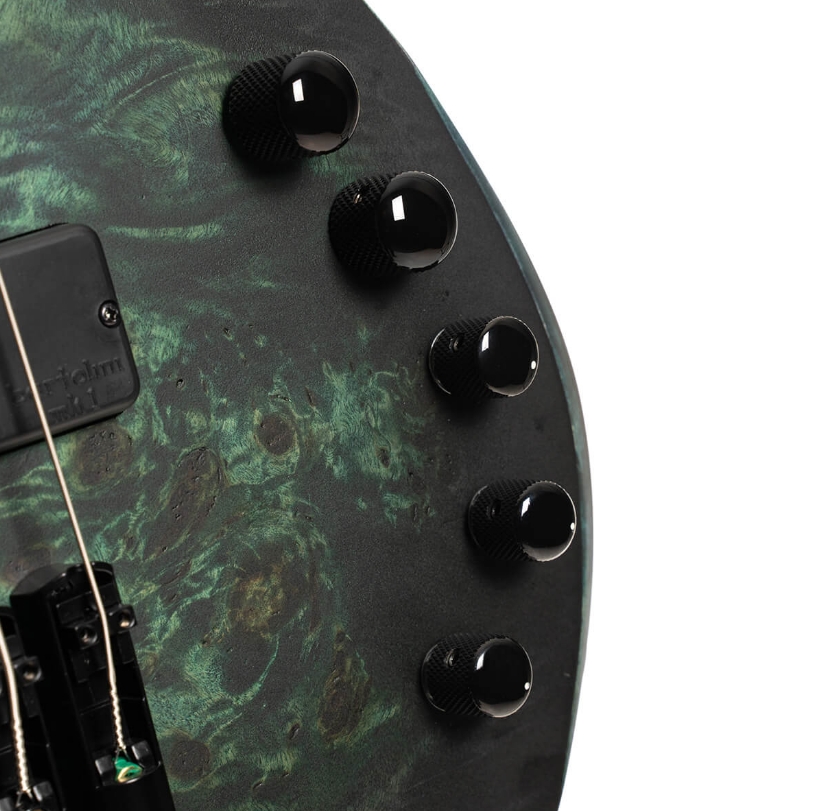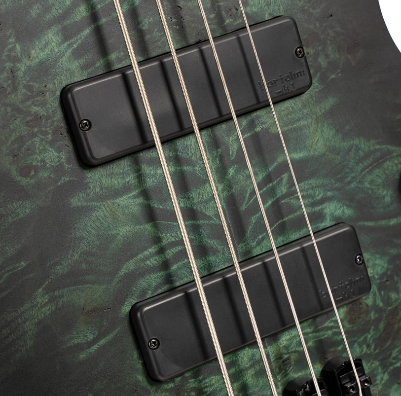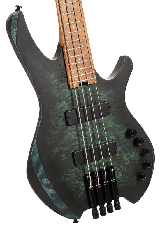 Konstrukcja i korpus: Model Cort Space 4 SDG w/BAG prezentuje wyjątkową konstrukcję basu typu headless, która zapewnia doskonałą ergonomię i idealne wyważenie instrumentu bez względu na to, czy grasz stojąc, czy siedząc. Korpus wykonany jest z wysokiej jakości klonu miękkiego, co przekłada się na naturalną, klarowną barwę z zrównoważonym środkiem pasma oraz świetną reakcję na atak struny. Płyta wierzchnia z topoli Burl 6T to nie tylko piękny wizualnie element wykończenia, ale także wpływa na rezonans i harmoniczne brzmienia, tworząc instrument o charakterze premium. Charakterystyczny kształt korpusu Space sprawia, że instrument jest lekki, kompaktowy i komfortowy nawet podczas długich sesji gry, a starannie dobrane wykończenie w kolorze Star Dust Green podkreśla nowoczesny styl basu. W zestawie z instrumentem znajduje się pokrowiec, co dodatkowo zwiększa jego praktyczność przy przechowywaniu i transportowaniu.  Gryf i podstrunnica: Gryf w Cort Space 4 SDG w/BAG to prawdziwy majstersztyk inżynierii projektowej, zbudowany z 7-częściowej kombinacji klonu pieczonego, orzecha, amarantu i klonu, co nie tylko stabilizuje konstrukcję, ale także pozytywnie wpływa na barwę i dynamiczny charakter tonu. Przykręcany bolt-on gryf o profilu C Shape zapewnia intuicyjne, szybkie i płynne prowadzenie palców po całej długości jego 34‑calowej (864 mm) menzury. Podstrunnica z klonu pieczonego oraz promień 400 mm stwarzają idealne warunki dla technicznej gry, umożliwiając zarówno precyzyjne prowadzenie linii basowych, jak i swobodne wykorzystanie wyższych pozycji. Bas wyposażony jest w 24 progi Medium‑Jumbo wykonane z nickel silver, które gwarantują wyraźną intonację, a innowacyjny zero fret, zamiast tradycyjnego siodełka, maksymalizuje stabilność strojenia oraz komfort gry. Dzięki temu rozwiązaniu gryf pozostaje responsywny i przewidywalny w każdym miejscu na podstrunnicy.