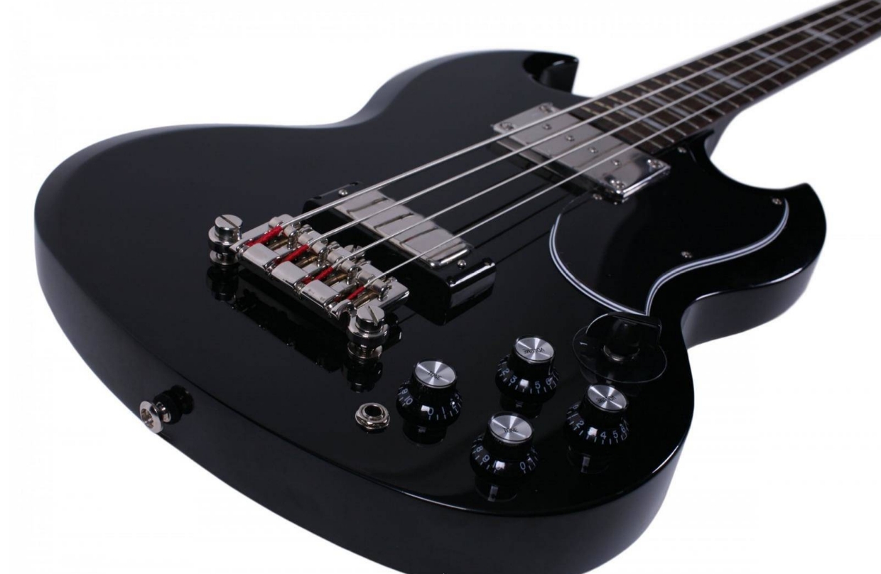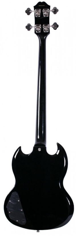 Konstrukcja i korpus: Bas Epiphone EB-3 EB wyróżnia się charakterystycznym korpusem typu SG wykonanym w całości z mahoniu, co przekłada się na ciepły, głęboki rezonans oraz wyraźny dół pasma. Smukła bryła z głębokimi wycięciami umożliwia bardzo swobodny dostęp do wszystkich 22 progów, dzięki czemu instrument zachowuje pełną funkcjonalność w całym zakresie skali 34". Mahoń zapewnia długie wybrzmiewanie i miękki atak, typowy dla klasycznych konstrukcji basowych inspirowanych latami 60., a kompaktowa forma korpusu poprawia ergonomię oraz rozkład masy podczas gry. Całość pokryto lakierem w wykończeniu Ebony, który nadaje instrumentowi elegancki, jednolity wygląd i podkreśla jego vintage’owy charakter, jednocześnie chroniąc drewno przed czynnikami zewnętrznymi.  Gryf i podstrunnica: Wklejany mahoniowy gryf Epiphone EB-3 EB współpracuje z korpusem jako jeden rezonujący układ, co wzmacnia sustain i poprawia przenoszenie niskich częstotliwości. Skala 34" zapewnia właściwe napięcie strun typowe dla klasycznych basów elektrycznych, a palisandrowa podstrunnica wprowadza dodatkowe ocieplenie barwy oraz łagodzi najwyższe harmoniczne. Zestaw 22 progów umożliwia pełne wykorzystanie skali instrumentu wraz z komfortową grą w wysokich pozycjach, a naturalnie śliska struktura palisandru poprawia płynność przesuwania dłoni. Profil gryfu został zaprojektowany z myślą o wygodnym chwycie zarówno przy technice palcowej, jak i kostkowej, dzięki czemu instrument zachowuje czytelność artykulacji oraz stabilność intonacji w całym zakresie podstrunnicy.