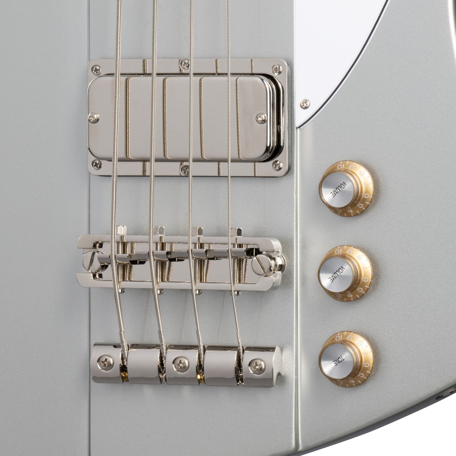 Pozostałe elementy: Epiphone Thunderbird '64 Silver Mist jest wykończony w eleganckim kolorze Silver Mist, który nawiązuje do klasycznego, samochodowego stylu, charakterystycznego dla lat 60. Osprzęt w kolorze niklu dodaje instrumentowi elegancji i trwałości. Zestaw obejmuje również struny o rozmiarze .045, .065, .085, .105, które zapewniają bogaty dźwięk i komfort gry. W zestawie znajduje się także pokrowiec Premium Gig Bag, który zapewnia bezpieczeństwo instrumentu podczas transportu oraz chroni go przed uszkodzeniami.  Epiphone Thunderbird '64 Silver Mist - specyfikacja: