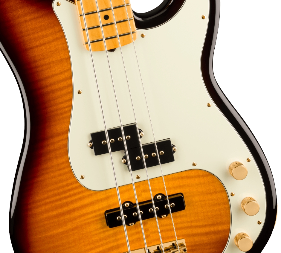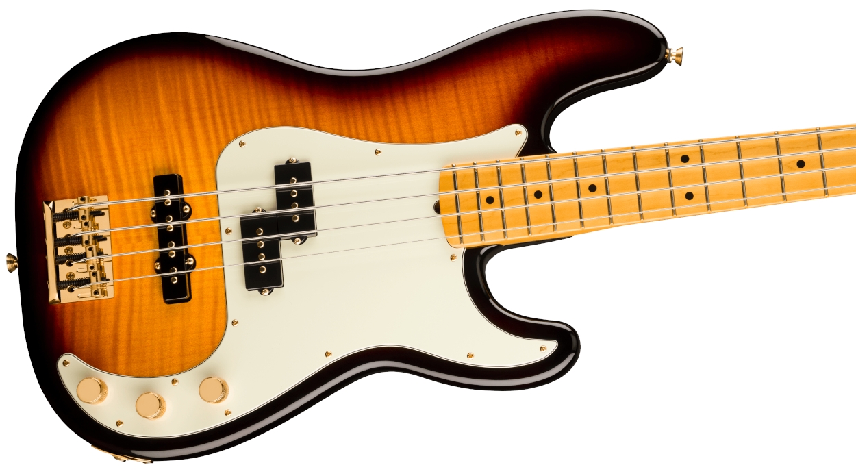 Konstrukcja i korpus: Fender 75th Anniversary American Professional PJ Bass MN 2TS wyróżnia się starannie zaprojektowaną konstrukcją opartą na wyselekcjonowanym korpusie z olchy, który od lat stanowi fundament klasycznego brzmienia instrumentów Fender dzięki rezonansowości, sprężystemu atakowi i zbalansowanemu pasmu. Całość uzupełnia efektowna płyta wierzchnia z klonu płomienistego, nadająca instrumentowi ekskluzywnego charakteru oraz podkreślająca jego jubileuszowy status. Konstrukcja bolt-on zapewnia odpowiednią dynamikę i czytelność dźwięku, a jednocześnie ułatwia serwisowanie i wpływa na charakterystyczną odpowiedź tonalną. Wykończenie w klasycznym 2-Color Sunburst podkreśla rysunek drewna i nawiązuje do historycznych modeli marki. Ergonomicznie wyprofilowany korpus oraz rzeźbiona stopka gryfu zwiększają komfort gry i umożliwiają swobodniejszy dostęp do wyższych pozycji. Całość dopełnia jubileuszowa płytka mocowania gryfu, podkreślająca limitowany charakter serii oraz kolekcjonerską wartość instrumentu.  Gryf i podstrunnica: W modelu Fender 75th Anniversary American Professional PJ Bass MN 2TS zastosowano klonowy gryf o legendarnym profilu ‘63 P Bass oraz nowoczesnym kształcie Modern “C”, który łączy klasyczne odczucia z nowoczesną ergonomią. Satynowe wykończenie Super-Natural na tylnej części gryfu zapewnia wyjątkową gładkość i naturalne prowadzenie dłoni, redukując tarcie podczas gry. Podstrunnica z klonu o promieniu 9.5” i zaokrąglonych krawędziach znacząco poprawia komfort użytkowania, umożliwiając płynne poruszanie się po całej jej długości. Instrument wyposażono w 20 progów medium jumbo, które ułatwiają precyzyjne dociskanie strun i wpływają na czytelność artykulacji. Stabilność konstrukcji wspierają grafitowe pręty Posiflex, zwiększające odporność gryfu na zmiany warunków otoczenia. Kościane siodełko o szerokości 41,3 mm dodatkowo wpływa na klarowność wybrzmiewania otwartych strun oraz poprawia sustain, tworząc spójną całość z resztą konstrukcji.