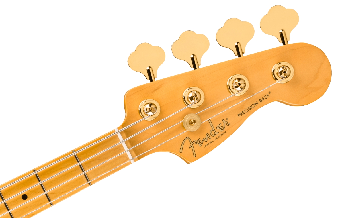 Mostek i klucze: Fender 75th Anniversary American Professional PJ Bass MN 2TS posiada mostek HiMass Vintage, który dzięki swojej zwiększonej masie oraz precyzyjnej konstrukcji znacząco poprawia sustain, rezonans i szybkość reakcji instrumentu. Wykorzystanie stalowej płyty bazowej walcowanej na zimno oraz mosiężnych elementów wpływa na stabilność i bogactwo harmoniczne dźwięku. Mostek umożliwia zarówno przewlekanie strun przez korpus, jak i montaż typu top-load, co daje większą elastyczność w dopasowaniu odczucia napięcia strun. Instrument wyposażono również w lekkie klucze Fender Lightweight Vintage-Style z taperowanymi trzpieniami, które zwiększają stabilność stroju i poprawiają kąt prowadzenia strun przez siodełko. Zmniejszona masa kluczy pozytywnie wpływa na balans całego instrumentu, a ich precyzyjna praca pozwala na dokładne strojenie. Całość osprzętu utrzymana jest w eleganckim, złotym wykończeniu, podkreślającym jubileuszowy charakter modelu.