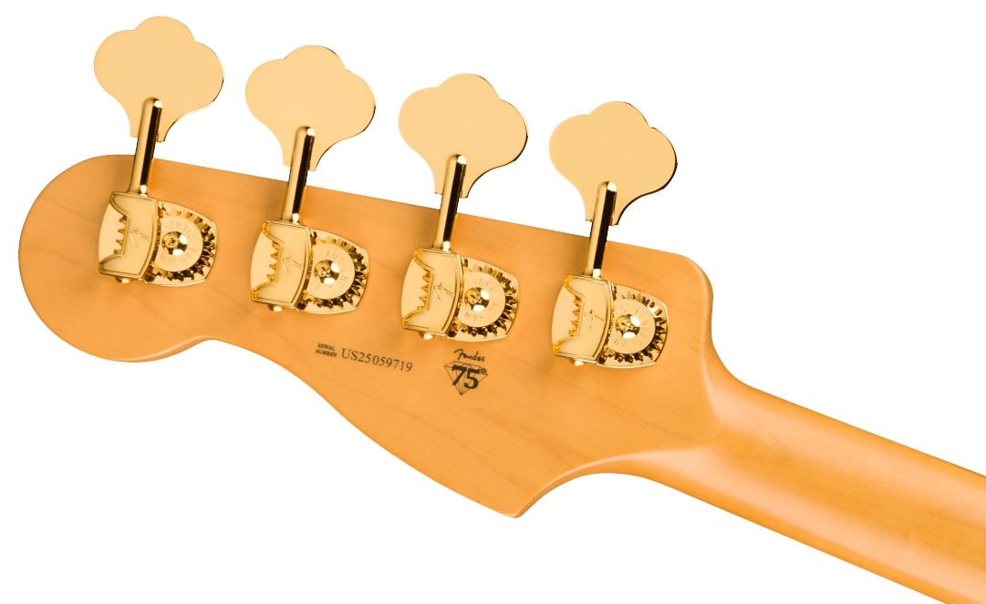 Pozostałe elementy: Fender 75th Anniversary American Professional PJ Bass MN 2TS został wyposażony w wysokiej klasy komponenty uzupełniające, które wpływają zarówno na komfort użytkowania, jak i walory estetyczne. Fabrycznie montowane struny Fender USA 7250M Nickel Plated Steel o grubości .045-.105 oferują zbalansowane brzmienie z odpowiednią ilością jasności i ciepła, dobrze współpracując z charakterem przetworników V-Mod II. Złoty osprzęt obejmujący wszystkie metalowe elementy stanowi spójne wizualnie dopełnienie konstrukcji, nadając instrumentowi luksusowego wyglądu. Limitowany charakter edycji 75th Anniversary powinien zachęcić kolekcjonerów i entuzjastów marki Fender, a dbałość o detale wykończeniowe oraz jakość montażu podkreślają profesjonalny standard wykonania. Połączenie klasycznych rozwiązań konstrukcyjnych z nowoczesnymi usprawnieniami sprawia, że model ten stanowi rozwinięcie legendarnej linii Precision Bass, oferując jednocześnie współczesną funkcjonalność i wyjątkowy charakter wizualny.  Fender 75th Anniversary American Professional PJ Bass MN 2TS - specyfikacja