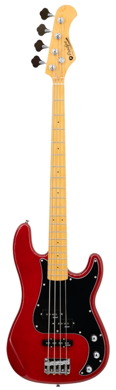 Prodipe JB90MA ALDER 4C1 - cechy:Konstrukcja i korpus: Prodipe JB90MA ALDER 4C1 to instrument o klasycznym kształcie PJ, który łączy w sobie charakterystyczny wygląd i funkcjonalność. Korpus wykonany z olchy, pokryty transparentnym lakierem w odcieniu czerwieni, gwarantuje naturalny rezonans i wyraźny, dynamiczny ton z pełnym środkiem pasma. Konstrukcja bolt-on zapewnia doskonałą transmisję drgań gryfu do korpusu, co wpływa na klarowność i sustain dźwięku. Wykończenie instrumentu podkreśla ultravintage’owy charakter inspirowana latami 70., co nadaje mu ponadczasowy wygląd. Solidność materiałów i precyzja wykonania sprawiają, że Prodipe JB90MA ALDER 4C1 oferuje wysoką jakość w swojej kategorii cenowej, przy zachowaniu lekkości i komfortu użytkowania, a zoptymalizowany kształt korpusu ułatwia wygodną grę w każdej pozycji. Gryf i podstrunnica: Gryf Prodipe JB90MA ALDER 4C1 wykonany jest z lakierowanego klonu kanadyjskiego w klasycznym profilu Seventies, który nie jest ani zbyt cienki, ani zbyt szeroki, co zapewnia naturalny komfort podczas gry. Podstrunnica z klonu o promieniu 9,5 cala gwarantuje wyraźny atak i równomierną reakcję przy każdym uderzeniu struny, a 20 progów typu Medium Jumbo umożliwia precyzyjne prowadzenie palców i płynne zmiany pozycji. Siodełko o szerokości 42 mm i menzura 34 cale wspierają stabilną intonację i naturalny rozkład napięcia strun. Dzięki temu gryf jest doskonale zbalansowany, umożliwia wyraźny sustain i czysty ton zarówno przy grze palcami, jak i z użyciem kostki, co czyni instrument wszechstronnym w zastosowaniu muzycznym.
