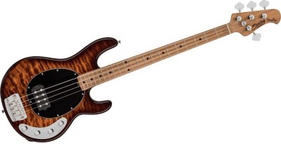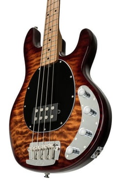 Gitara basowa 4-strunowa z serii Ray, która nawiązuje wyglądem i brzmieniem do starych, klasycznych basów Music Man. Instrument dobrze leży w dłoni dając dużą swobodę grania. Klasyczne brzmienie humbuckera świetnie sprawdza się w funku i rocku a to wszystko dzięki wykorzystaniu przystawki H-1 Alnico i 3-pasmowego aktywnego przedwzmacniacza. Wykonany z Mahoniu korpus zapewnia wydłużony sustain, dzięki któremu możemy tworzyć przestrzeń w utworach wypełnioną subtelnym brzmieniem. Top wykonany z Quilted Maple Veneer to miłe dla oka wykończenie komponujące się idealnie z chromowanym mostem Sterling by Music Man Designed Bridge i potencjometrami. Wykonane z Prażonego Klonu (Roasted Maple) gryf i podstrunnica stanowią subtelny kontrast dla korpusu a czarne markery w kształcie kropek są elegancką ozdobą. Instrument odnajdzie się w wielu stylach muzycznych i przyciągnie wzrok niejednego basisty.