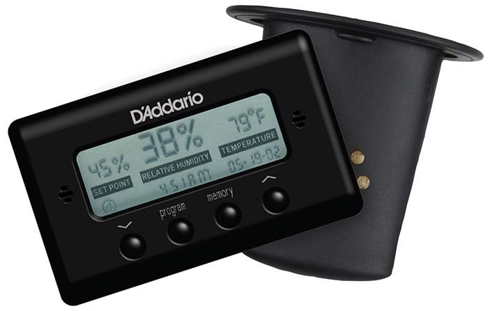 Czujnik wilgotności i temperatury Daddario PW-GH-HTS pomoże w utrzymaniu właściwego mikroklimatu, by uniknąć uszkodzenia Twojego instrumentu. Czujnik ten jest precyzyjnie zaprojektowanym higrometrem, który cyfrowo wskazuje aktualne poziomy wilgotności względnej w zakresie od niskiej (poniżej 20%), do 99%. Temperatura jest wyświetlana w skali Celsjusza albo Farenheita,w zakresie od -32°F (-35,6°C) do 122°F(50°C). Chroniony patentem projekt pozwala zaprogramować minimalną, żądaną wilgotność powietrza. Kiedy wilgotność spada poniżej tego poziomu, ikona z kroplą wskaże, że konieczne jest użycie nawilżacza. Urządzenie posiada pamięć, która wskazuje, na jaką najwyższą i najniższą temperaturę oraz wilgotność był narażony Twój instrument, wraz z dokładną datą i czasem, kiedy to się stało. Pamięć obejmuje okres od ostatniego wyzerowania urządzenia.