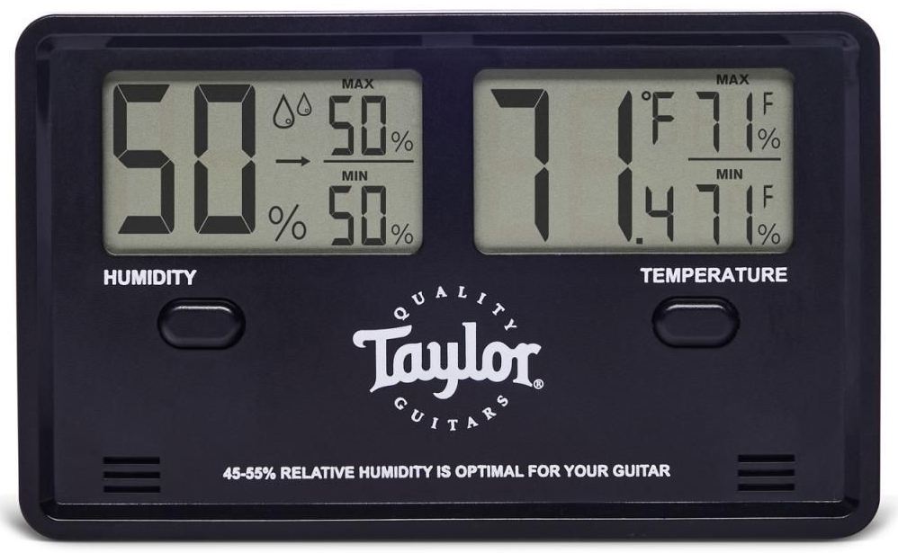 Taylor Hygrometer to niezastąpiony higrometr dla każdego muzyka dbającego o swoje instrumenty. Urządzenie pozwala na precyzyjny pomiar wilgotności względnej w zakresie od 10% do 95% oraz temperatury od -40°C do 70°C, dzięki czemu idealnie sprawdza się zarówno w futerale gitarowym, jak i w domowym studiu czy pokoju ćwiczeń. Duży, czytelny, podwójny wyświetlacz LCD ułatwia szybki odczyt danych, a wbudowana pamięć zapisuje najwyższe i najniższe wartości wilgotności oraz temperatury. Dzięki dokładności na poziomie ±5%, Taylor Hygrometer pomaga w skutecznej kontroli warunków, które mają kluczowy wpływ na kondycję i brzmienie instrumentów akustycznych.