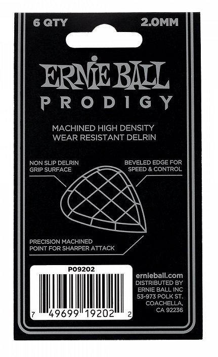 - Kostki Ernie Ball Prodigy są wykonane z bardzo wytrzymałego materiału Delrin, który zapewnia bezpieczniejszą powierzchnię antypoślizgową. Obrobiona fazowana krawędź i ostry punkt na dole pozwalają na mniejszy opór, dodatkowe artykulacje i precyzyjną kontrolę podczas gry.