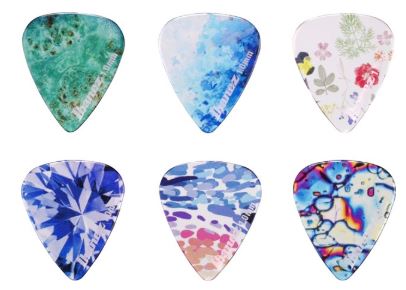 Ibanez KALEIDO to całkiem atrakcyjna seria kostek gitarowych, wyprodukowanych w Japonii. Wyjątkowe właściwości materiału, z którego zostały stworzone, pozwoliły osiągnąć nie tylko ciekawy design, ale również imponującą trwałość. Materiał, o którym piszę to kopoliestr, nazywany też “Tritan”, który jest znakiem towarowym firmy Eastman Chemical Company z Tennessee. Kopoliestr jest przezroczysty jak szkło, ale także trwały i łatwy w kształtowaniu. Ibanez jest podobno pierwszą firmą, która wykorzystuje "Tritan" do robienia kostek gitarowych. które charakteryzuje odważna, barwna grafika i dość łagodny atak dźwiękowy, pozwalający na swobodną kontrolę strun. Kostki te są nieco bardziej miękkie w porównaniu do zwykłych kostek i dostępne będą w trzech różnych grubościach: 0,8mm / 1,0mm / 1,2mm.