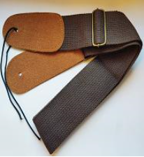 Brązowy, parciany pasek gitarowy z metalowymi sprzączkami i skórzanymi końcówkami.