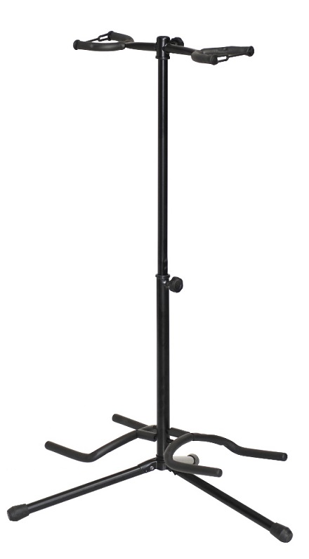 Solidny statyw na dwie gitary. Ja używam go rotacyjnie do trzech gitar: klasycznej, elektrycznej i gitary basowej short scale. W każdej kombinacji stoi stabilnie. Nawet tylko z jedną dowolną gitarą jest stabilny i się nie przewraca. Zajmuje trochę miejsca ale i tak oczywiście mniej niż dwa pojedyncze statywy. Wykończenie też jest w porządku, miękkie obicia podstawek i uchwytów ( podpórek ). Naprawdę dobry wybór dla posiadaczy dwóch gitar.