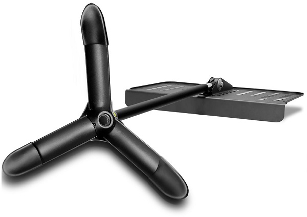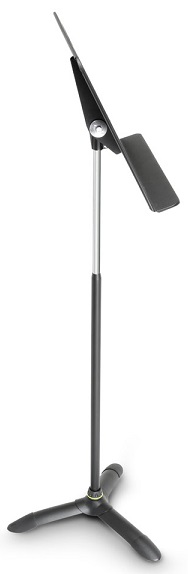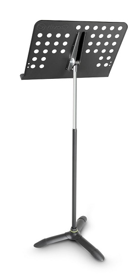 Pulpit na nuty z dziurkowaną płytą stalową marki Gravity z serii NS. Jest to to orkiestrowy model z perforowaną półką stalową i ciężką trójnożną podstawą. Wysokość i nachylenie podpórki na nuty można wygodnie regulować bez śrub ustalających w zależności od pozycji osoby korzystającej z pulpitu (siedząca lub stojąca).