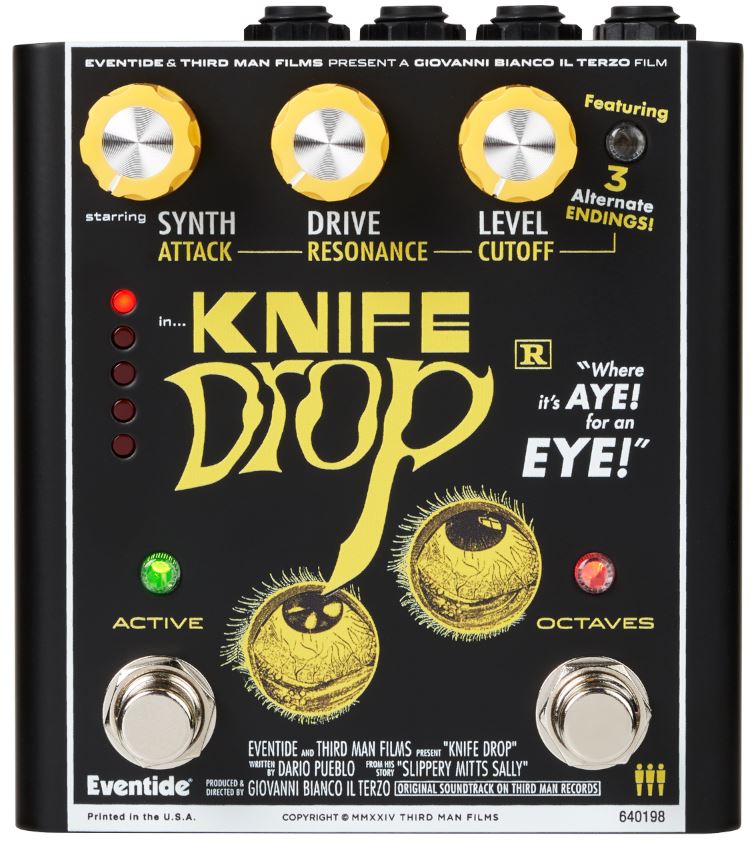Eventide Knife Drop to efekt gitarowy, który łączy sub-oktawe i mroczny fuzz z wyjątkowymi funkcjami analogowego syntezatora. Stworzony we współpracy z Third Man Hardware i Jackiem Whitem, oferuje od agresywnego, trzystopniowego blendu sygnałów po przerażające sub-oktawy. Knife Drop pozwala na pełne zanurzenie się w nieokiełznanej przestrzeni dźwiękowej, oferując rozbudowane opcje regulacji filtrów i ADSR-style Envelope, by idealnie dostosować Attack, Resonance i Cutoff. Przyciągające uwagę LED-owe przyciski i kontrola oktaw oraz kompatybilność z H90 Control sprawiają, że jest to efekt wręcz stworzony do budowania niepowtarzalnych i pulsujących grozą brzmień. Knife Drop to doskonały wybór dla muzyków gotowych na eksplorację nowych granic brzmieniowych i kreowanie dźwięków rodem z mrocznego koszmaru.