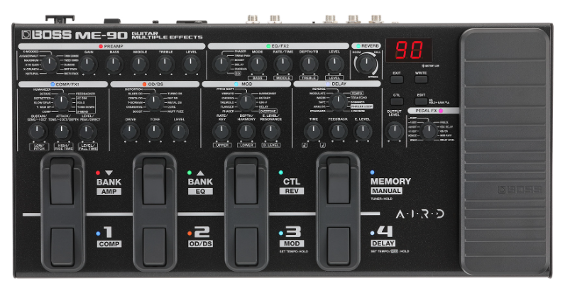 Boss ME-90 oferuje ogromną bibliotekę efektów BOSS, w tym przesterów, zniekształceń, efektów pitch/mod, opóźnień i pogłosów. Zawiera również 11 dedykowanych efektów Pedal FX, looper oraz specjalistyczne efekty. Istnieje pętla send/return do podłączenia zewnętrznych pedałów.