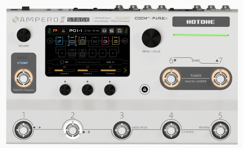 HoTone Ampero II Stage to zaawansowany modeler wzmacniacza i procesor efektów stworzony z myślą o dynamicznych występach na scenie. Wyposażony w potrójną platformę cyfrową i konwertery ESS Sabre oferuje doskonałą jakość dźwięku. Zestawienie ośmiu przełączników nożnych, intuicyjnej obsługi oraz 5-calowego ekranu dotykowego z inteligentnym UI sprawiają, że jest niezwykle elastyczny i łatwy w użyciu. Dzięki funkcjom jak Bluetooth connectivity, łańcuchy efektów, nagrywanie, streaming, ale także bogatej bibliotece z ponad 460 efektami, Ampero II Stage stanowi kompleksowe narzędzie dla muzyków, umożliwiające pełną kontrolę nad brzmieniem podczas koncertów, nagrań czy sesji treningowych. Lekka, aluminiowa obudowa sprawia, że jest przenośny i gotowy do podbicia każdej sceny.