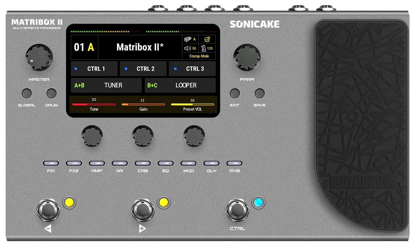 Sterowanie i interfejs użytkownika: Sonicake QME-100 Matribox II został zaprojektowany z myślą o intuicyjnej obsłudze, oferując duży kolorowy ekran oraz przyjazny interfejs użytkownika, który ułatwia nawigację i edycję parametrów. Urządzenie posiada 3 przełączniki nożne (footswitches) z możliwością pracy w 2 konfigurowalnych trybach, co pozwala dostosować sposób sterowania do indywidualnych preferencji. Wbudowany pedał ekspresji umożliwia dynamiczne sterowanie wybranymi parametrami efektów, a dodatkowo istnieje możliwość podłączenia zewnętrznego pedału ekspresji oraz przełączników nożnych, co zwiększa zakres kontroli nad Sonicake QME-100 Matribox II.