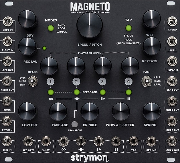 Magneto jest stereofonicznym, wielogłowicowym delay'em taśmowym, który działa również jako looper, phrase sampler, vintage spring reverb, phase-aligned clock multiplier, chaotic oscillator, sub-oscillator z zerową latencją i wiele innych.