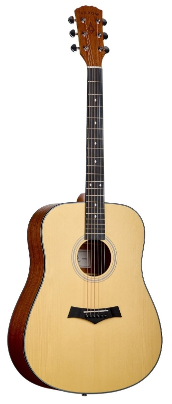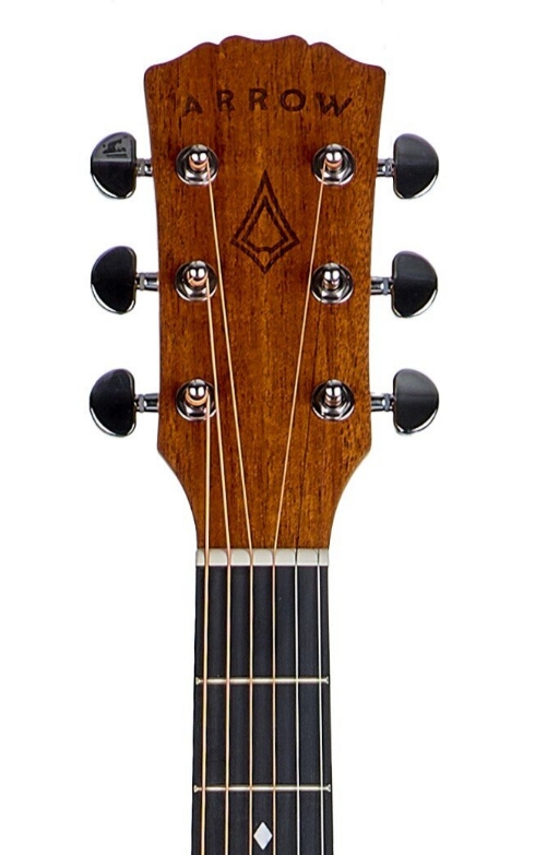 Konstrukcja i korpus: Arrow Silver D NT Natural to gitara akustyczna typu dreadnought, której konstrukcja została zaprojektowana z myślą o maksymalnej projekcji dźwięku, klarowności i klasycznym charakterze brzmieniowym. Pełnowymiarowy korpus o tradycyjnej formie zapewnia dużą objętość pudła rezonansowego, co przekłada się na wysoką głośność i wyrazisty bas. Lita płyta wierzchnia ze świerku Engelmann gwarantuje naturalną dynamikę, dobrą reakcję na artykulację oraz bogate spektrum harmonicznych, natomiast tył i boki wykonane z mahoniu odpowiadają za ciepło, równowagę i spójność dźwięku. Matowe, naturalne wykończenie NT podkreśla strukturę drewna i nadaje instrumentowi elegancki, minimalistyczny wygląd, jednocześnie zwiększając komfort użytkowania.  Gryf i podstrunnica: Gryf w modelu Arrow Silver D NT Natural wykonano z drewna okume, które charakteryzuje się stabilnością, niską masą i przyjemnym odczuciem w dłoni, co sprzyja komfortowej grze nawet podczas dłuższych sesji. Połączenie gryfu z korpusem typu dovetail zwiększa transfer drgań, wpływając pozytywnie na sustain i spójność brzmienia całego instrumentu. Ergonomiczny profil gryfu oraz standardowa szerokość siodełka 43 mm sprawiają, że gitara jest wygodna zarówno dla początkujących, jak i bardziej doświadczonych gitarzystów. Podstrunnica z materiału richlite zapewnia wysoką odporność na zmiany wilgotności i temperatury, zachowując precyzję intonacji. Dwudrożny pręt napinający umożliwia dokładną regulację gryfu, a 20 progów pozwala na swobodne poruszanie się po całym zakresie skali instrumentu.