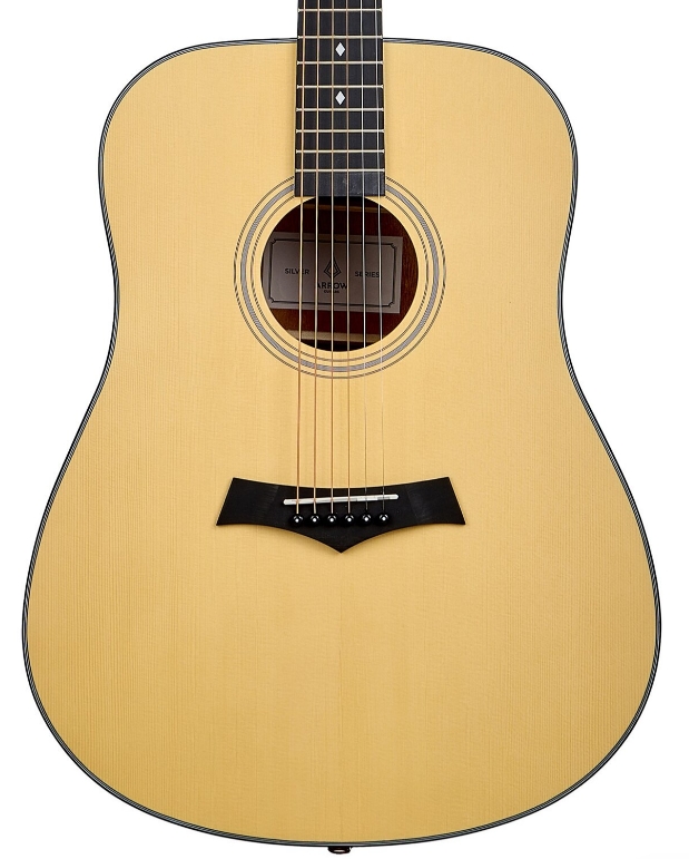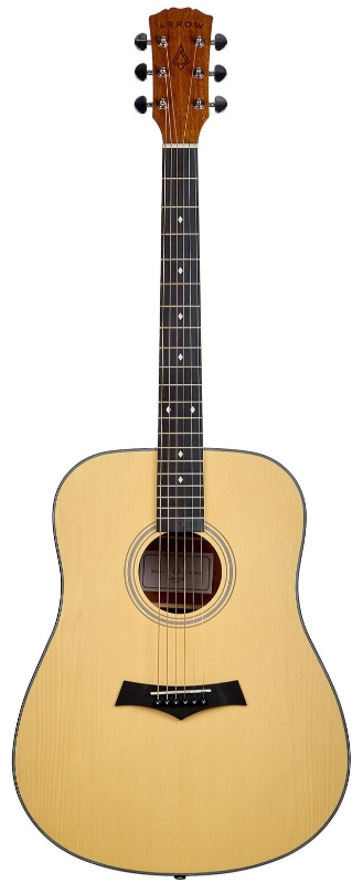 Pozostałe elementy: Arrow Silver D NT Natural wyposażona jest w siodełko wykonane z materiału PPS, który wspiera stabilność stroju oraz równomierny rozkład napięcia strun. Całość konstrukcji opiera się na nowoczesnych, trwałych materiałach, zachowując jednocześnie klasyczne podejście do budowy gitary akustycznej. Naturalna kolorystyka, chromowane detale oraz staranne wykończenie tworzą spójną i estetyczną całość, która dobrze prezentuje się w każdych warunkach użytkowych. Gitara została zaprojektowana jako uniwersalny instrument akustyczny, odpowiedni do nauki, gry akompaniującej i samodzielnego muzykowania, oferując solidne wykonanie, wysoki komfort oraz charakterystyczne brzmienie modelu Arrow Silver D NT Natural.  Arrow Silver D NT Natural - specyfikacja: