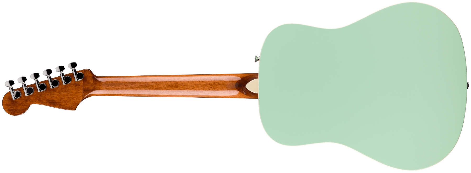 Konstrukcja i korpus: Gitarę Fender California Standard Redondo Mini SFG wyróżnia kompaktowy korpus w kształcie zmniejszonego dreadnoughta. Płyta wierzchnia została wykonana z laminowanego świerku, natomiast boki i tył z laminowanego sapele, co zapewnia doskonałą równowagę między trwałością a pełnym, klarownym brzmieniem. Dzięki całkowicie laminowanej konstrukcji instrument charakteryzuje się zwiększoną odpornością na zmiany temperatury i wilgotności, jednocześnie zachowując rezonans i bogaty ton typowy dla większych gitar akustycznych. Korpus wykończono błyszczącym lakierem w kolorze Surf Green, który nadaje gitarze elegancki, klasyczny wygląd i długotrwałą ochronę drewna. Ikoniczna główka Fendera z układem sześciu kluczy w linii prostej zapewnia równomierne napięcie strun oraz ułatwia ich wymianę, a odchylona do tyłu konstrukcja główki stabilizuje kąt przejścia strun nad siodełkiem, co wpływa na równomierną odpowiedź brzmieniową. Całość została uzupełniona chromowanymi elementami osprzętu, które dodają gitarze nowoczesnego charakteru i trwałości.  Gryf i podstrunnica: Gryf gitary Fender California Standard Redondo Mini SFG wykonano z wysokiej jakości drewna okoume o smukłym, ergonomicznym profilu „C”, który zapewnia wygodny i naturalny chwyt dla każdej dłoni. Krótka menzura 578 mm (22,75”) oraz promień podstrunnicy 241 mm (9,5”) gwarantują komfortowe prowadzenie palców po progach, co sprawia, że instrument jest przyjazny zarówno dla początkujących, jak i bardziej doświadczonych gitarzystów. Podstrunnica z orzecha zapewnia stabilność oraz wyraźne i dynamiczne brzmienie, a 20 progów w stylu Vintage umożliwia precyzyjne granie zarówno akordów, jak i melodii. Całość konstrukcji gryfu jest starannie wyprofilowana i wykończona, dzięki czemu gra na gitarze jest intuicyjna i przyjemna, a każdy detal – od grubości gryfu po ustawienie progów – został zaprojektowany z myślą o maksymalnym komforcie użytkownika.