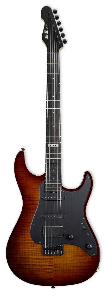 E-II SN-3 przyjmuje tradycyjny kształt gitary, a następnie maksymalizuje każdy jego aspekt dla współczesnych stylów muzycznych. Posiada konstrukcję bolt-on w skali 25,5”, z korpusem olchowym i topem z klonu w fantastycznym wykończeniu Tiger Eye Sunburst. Ma klonowy gryf z hebanową podstrunnicą, która zawiera 22 progi XJ.