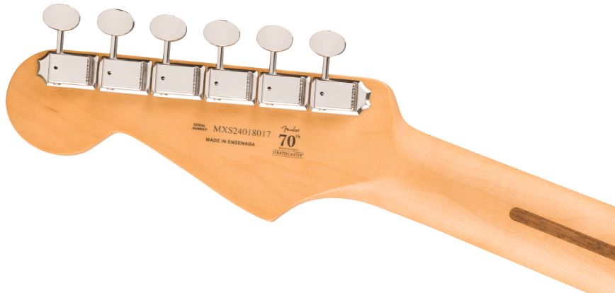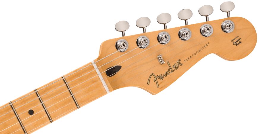 Korpus Stratocastera jest ikoną w świecie muzyki, znany ze swoich dwóch asymetrycznych wycięć, które umożliwiają łatwy dostęp do wyższych progów. Smukły i lekki korpus dodatkowo zwiększa komfort gry, a specjalnie wyprofilowane wycięcia poprawiają ergonomię, co jest kluczowe podczas intensywnego grania. Charakterystyczna płytka ochronna, czyli pickguard, chroni powierzchnię gitary przed zarysowaniami, zachowując jej estetykę na dłużej. Główka (headstock) gitary jest rozpoznawalna dzięki asymetrycznemu i zakrzywionemu kształtowi oraz logo Fendera, co nie tylko dodaje stylu, ale także zapewnia odpowiednie wyważenie instrumentu, wpływając na jego wygodę i stabilność podczas gry.  Gryf i Menzura