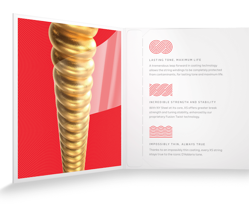 Nowa seria strun XS została stworzona pod hasłem: maximum life+smooth feel. Dzięki zastosowaniu ultra cienkiej powłoki na każdej strunie i unikatowego polimeru, uzyskano struny z wysoką odpornością, długą żywotnością niespotykanym odczuciem gładkości w czasie gry. Najnowsza technologia produkcji strun pozwoliła stworzyć odporny na pękanie produkt o dużej stabilności trzymania stroju. To najnowocześniejsze struny dostarczające wszystkiego, czego poszukuje współczeny muzyk - świetnego brzmienia, doskonałej intonacji, długiej żywotności i wspaniałego czucia pod palcami.