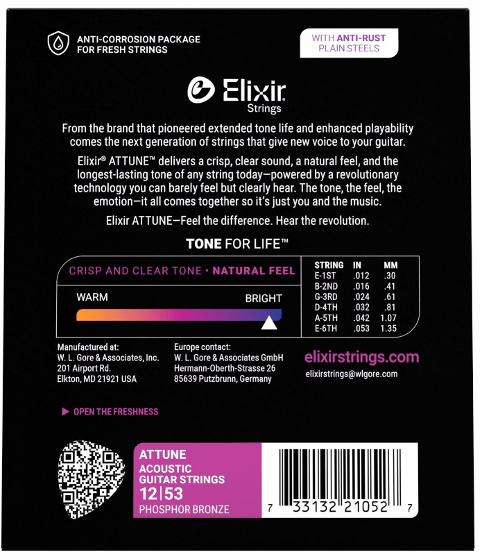 Dzięki innowacyjnej technologii, struny Elixir Attune Light 12-53 pozwalają gitarze wyrażać pełnię tonalną, subtelnie podkreślając każdy niuans dźwięku. Struny charakteryzują się wyjątkową trwałością, odpornością na intensywne uderzenia i najdłuższym czasem zachowania pierwotnego brzmienia spośród dostępnych modeli. To doskonały wybór dla muzyków ceniących klarowny, naturalny ton i niezawodność, które sprawdzą się w każdej sytuacji podczas codziennej gry i ćwiczeń.