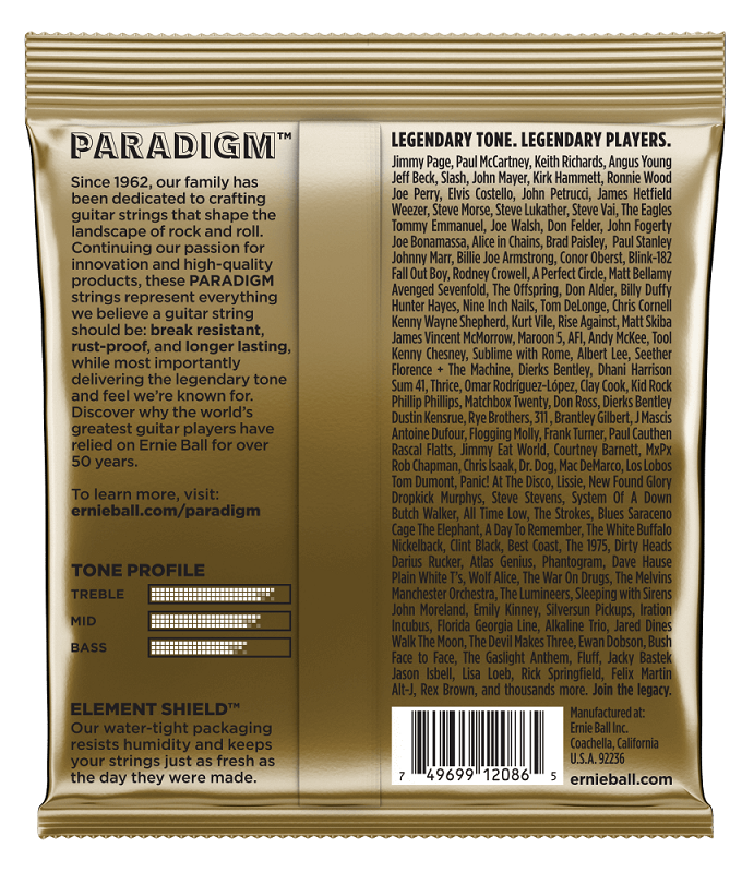 - Ultra nowoczesne struny akustyczne marki Ernie Ball ze zrewolucjonizowanej technologicznie serii Paradigm. Gromadzi ona modele najbardziej odporne na uszkodzenia mechaniczne, wilgoć i wiele innych. Osiągnięto to dzięki stworzeniu specjalnej i niespotykanej wcześniej powłoki dzięki opatentowanej przez producenta technologii Everlast oraz procesu plazmowego. Nie jest to klasyczny proces powlekania, gdyż nie jest ona wyczuwalna pod palcami i nie zużywa się tak jak zwykła powłoka. Dodatkowo struny Paradigm są całkowicie odporne na pękanie. Oczywiście w całym procesie tworzenia strun nie zapomniano o genialnym, klasycznym brzmieniu Ernie Balla! Prawdziwa rewolucja w strunach gitarowych!