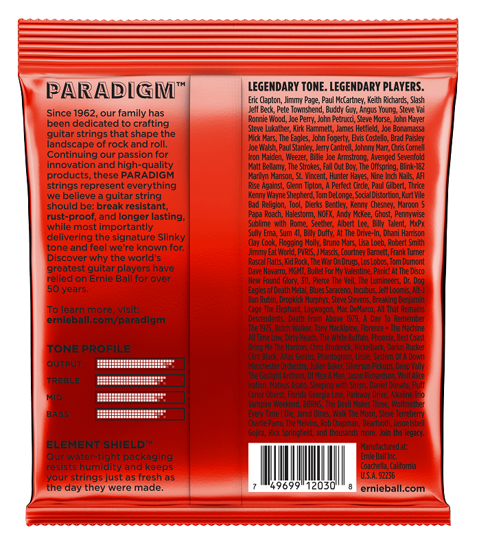 - Bardzo nowoczesne i zreformowane konfiguracyjnie struny do gitary elektrycznej marki Ernie Ball. Należą do nowoczesnej serii Paradigm. Nadano im niespotykaną dotąd odporność na pęknięcia i inne uszkodzenia techniczne. A wszystko to było możliwe dzięki połączeniu opatentowanej przez producenta nanotechnologi Everlast oraz zaawansowanego procesu plazmowego. Takie rozwiązanie gwarantuje niezawodną ochronę przed wilgocią i innymi negatywnymi substancjami wraz z zabezpieczeniem strun przed korozją. Nie zapomniano przy tym wszystkim o legendarnym, pożądanym brzmieniu Slinky.
