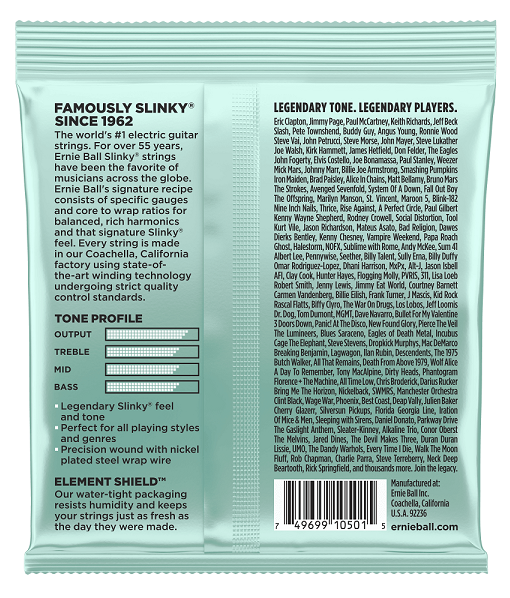 Struny Ernie Ball to jedne z najpopularniejszych wyborów muzyków na całym świecie. Od lat cenione są za genialne brzmienie i super czucie. W szerokiej ofercie znajdują się różne grubości, a także serie serie, wyróżniające się materiałem i chcarakterystycznymi cechami. Marce Ernie Ball zufało wielu znakomitych muzyków takich jak: Eric Clapton, Jimi Page, Jeff Beck i inni.