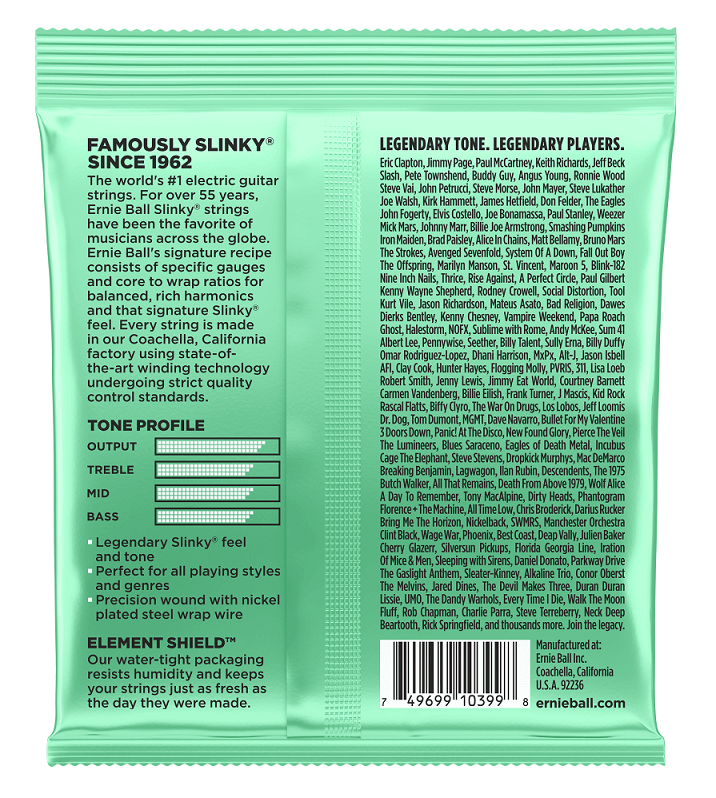 Struny do gitary elektrycznej Ernie Ball wykonane z niklowanego drutu stalowego owiniętego cynowanym drutem stalowym w kształcie sześcianu. Proste struny są wykonane ze specjalnie hartowanej, wysokowęglowej stali powlekanej cyną, co zapewnia dobrze zbalansowane brzmienie gitary. Struny długo zatrzymują świeżość i oferują jedyne w swoim rodzaju brzmienie!