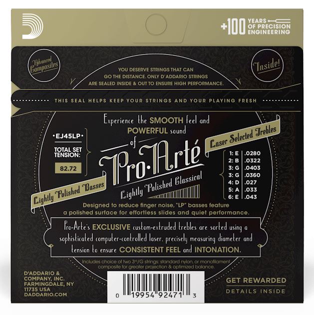 Struny D'Addario EJ45LP Pro Arte zapewniają zbalansowany, bogaty ton oraz komfortowe uczucie pod palcami, co sprawia, że są idealnym wyborem zarówno dla początkujących, jak i doświadczonych muzyków. Dzięki średniemu napięciu oferują dynamiczną projekcję dźwięku, umożliwiając wyjątkowe wykonanie muzyczne na każdym etapie gry. Sprawdź sam i odkryj, dlaczego struny D'Addario EJ45LP Pro Arte są wyborem numer jeden wielu profesjonalistów.  Daddario EJ45LP - specyfikacja: