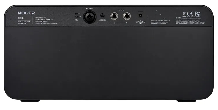 Wejścia, wyjścia i zasilanie: Mooer F40i Phantom Black posiada kompletny zestaw wejść i wyjść, które zapewniają pełną elastyczność podłączania instrumentów i mikrofonów. Wejście instrumentu 6,3 mm mono jack umożliwia podłączenie gitary lub basu, a wejście mikrofonowe XLR z osobnym regulatorem Gain i przełącznikiem phantom 48 V pozwala na użycie mikrofonów pojemnościowych. Wzmacniacz oferuje także wyjście słuchawkowe 3,5 mm stereo oraz dwa wyjścia liniowe 6,3 mm mono, które ułatwiają podłączenie do systemów nagłośnieniowych lub interfejsów audio. Urządzenie zasilane jest za pomocą dołączonego zasilacza 19 V / 2,5 A, a w zestawie znajduje się kabel USB-C do USB-A, co pozwala na natychmiastowe rozpoczęcie pracy z F40i Li Phantom Black bez dodatkowych akcesoriów.
