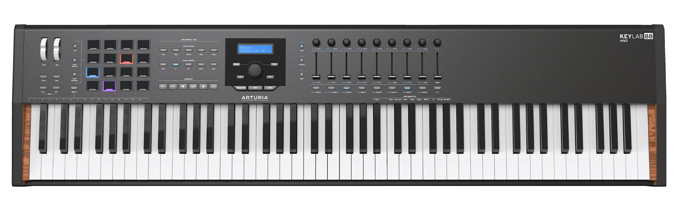 Arturia KeyLab 88 MKII to nowoczesna hybrydowa klawiatura MIDI. Zamontowana profesjonalna klawiatura Fatar oferuje 88 klawiszy z aftertouch, dając użytkownikowi prawdziwe wrażenie gry na pianinie. Dzięki takim zastosowanium klawiatury coraz częściej stają się instrumentami stosowanymi zamiennie z pianinami. Ważną cechą nowej klawiatury jest hybrydowy sterownik oprogramowaniem DAW. Ma wbudowane 9 encoder-ów, 9 fader-ów, 16 przycisków oraz centralny knobem nawigacyjny. Do tego 16 czułych na siłę uderzenia i docisk padów RGB, które nadają się idealnie pod kątem programowania beatów, czy wyzwalania sampli. Świetnie zbudowana klawiatura jest wytrzymała-dobrze sprawdz się w różnych warunkach na scenie i w studio a waży tylko 14 KG, więc śmiało możemy ją zabrać również w podróż. Bardzo obszerny pakiet oprogramowania oraz mnóstwo opcji połączeń wejść i wyjśc sprawiają, że to potężna maszyna, która ma duże możliwości.