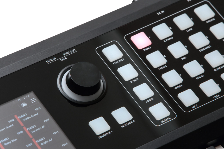 Przyciski - programowalny joystick, 8 pokręteł, 8 przycisków, 2 wejścia pedału przełącznika i 1 wejście ciągłego pedału sterującego daje pełną kontrolę nad urządzeniem. Dla intuicyjnego użytkowania, kolor podświetlenia przycisków i pokręteł jest możliwy do konfiguracji.