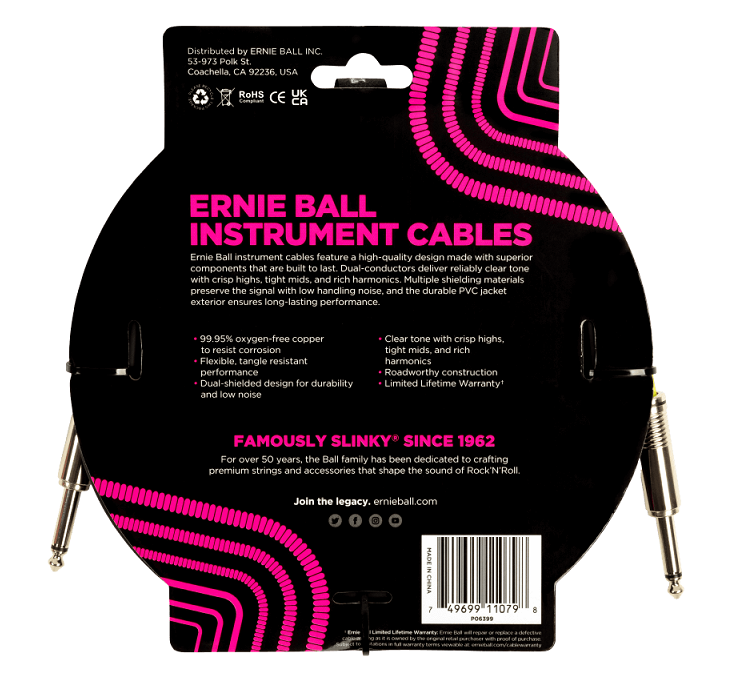 Kable instrumentalne Ernie Ball charakteryzują się wysokiej jakości konstrukcją wykonaną z najlepszych komponentów, które są zbudowane z myślą o trwałości. Podwójne przewodniki zapewniają niezawodnie czysty dźwięk z wyraźnymi tonami wysokimi, zwartymi średnimi i bogatymi harmonicznymi. Wiele materiałów ekranujących chroni sygnał przy niskim poziomie szumów związanych z obsługą, a osłona zewnętrzna z PVC zapewnia odporność na długi czas. Profesjonalnny kabel o dużej niezawodności i fajnym wyglądzie.