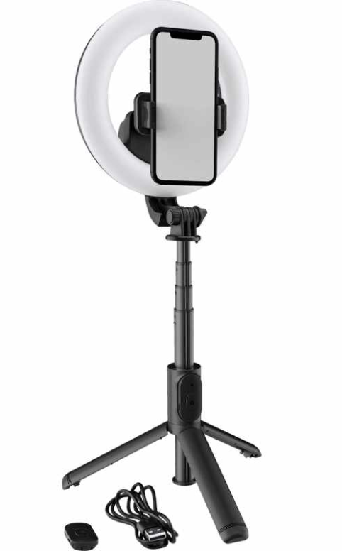 Kijek i uchwyt - zintegrowany kijek do selfie umożliwia łatwe wykonywanie autoportretów, dodając przy tym profesjonalny efekt oświetlenia wokół twarzy. Wbudowany w niego stojak pozwala na umieszczenie pierścienia na stole lub innym płaskim podłożu, co jest doskonałe podczas streamingu, rozmów wideo lub wideokonferencji, zapewniając stabilne i równomierne oświetlenie.