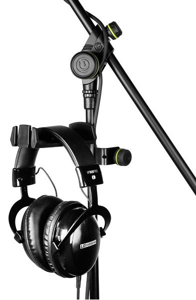 Uchwyt na słuchawki do statywu mikrofonowego marki Gravity. Uchwyt można zamontować na wszystkich statywach mikrofonowych, dzięki czemu słuchawki są zawsze łatwo dostępne. Dwie praktyczne luki służą do uporządkowanego powieszenia kabli połączeniowych, a nakładka śruby zaciskowej wykonana z tworzywa sztucznego chroni przed zarysowaniami.
