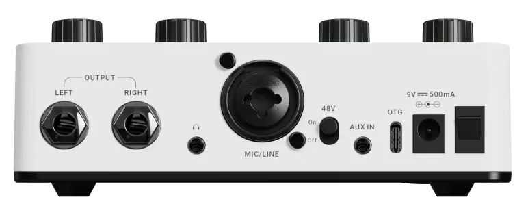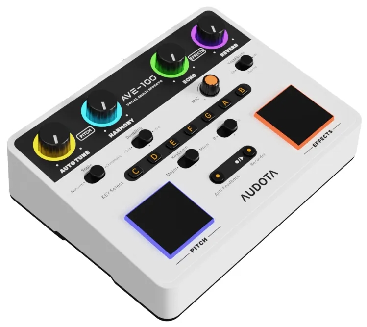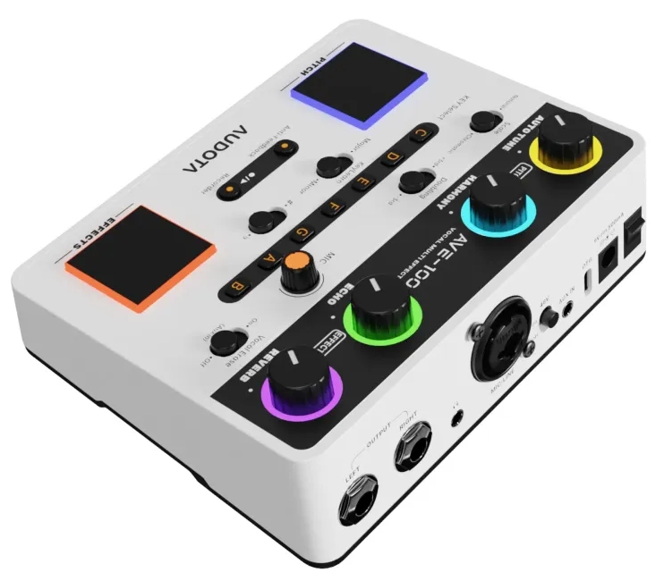 Sterowanie i łączność: Obsługa Audota AVE-100 została zaprojektowana z myślą o szybkości i intuicyjności. Sterowanie odbywa się za pomocą padów, które umożliwiają natychmiastowe włączanie i wyłączanie poszczególnych efektów. Urządzenie oferuje bogaty zestaw złączy, w tym wejście mikrofonowe XLR z zasilaniem phantom 48V, wejście jack 6,35 mm oraz AUX-IN, co zapewnia dużą elastyczność w podłączaniu różnych źródeł sygnału. Do dyspozycji użytkownika są także dwa wyjścia jack 6,35 mm mono oraz wyjście słuchawkowe 3,5 mm stereo o impedancji 32 Ω. Funkcja OTG umożliwia bezpośrednie połączenie ze smartfonem za pomocą złącza USB-C (przy użyciu opcjonalnego kabla), co rozszerza możliwości współpracy z urządzeniami mobilnymi.